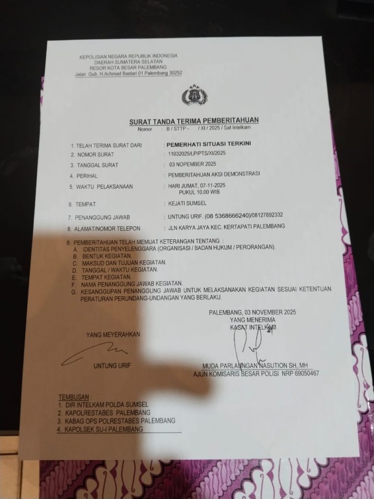 Beritapali.com |Palembang _ Lembaga Pemerhati Situasi Terkini (PST) dalam waktu dekat tepatnya pada Jum’at (07/11) akan menggelar aksi damai sekaligus membuat Laporan dan Pengaduan (Lapdu) ke Kejaksaan Tinggi Sumatera Selatan (Kejati Sumsel) di Jalan Gubernur H Bastari, Kecamatan Jakabaring, Palembang.