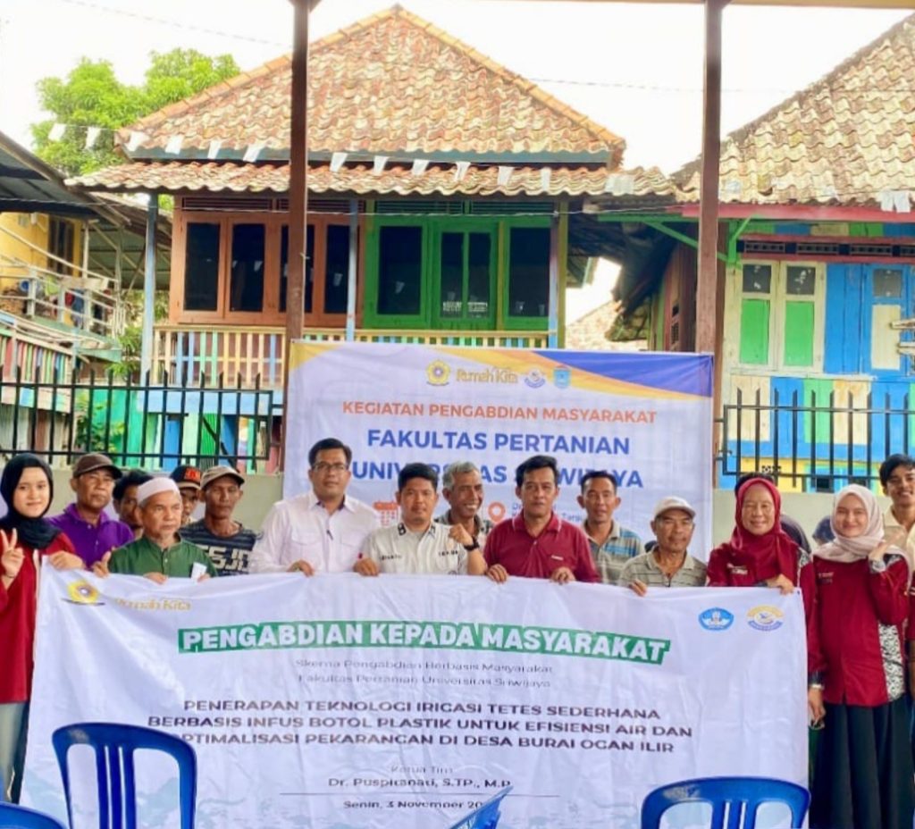 Ogan ilir KP/Beritapali.com—,Tim Pengabdian Kepada Masyarakat dari Program Studi Teknik Pertanian, Fakultas Pertanian, Universitas Sriwijaya, melaksanakan pengabdian kepada masyarakat bertajuk “Penerapan Teknologi Irigasi Tetes Sederhana Berbasis Infus Botol Plastik untuk Efisiensi Air dan Optimalisasi Pekarangan di Desa Burai, Kabupaten Ogan Ilir, Sumatera Selatan, Senin 03 November 2025.