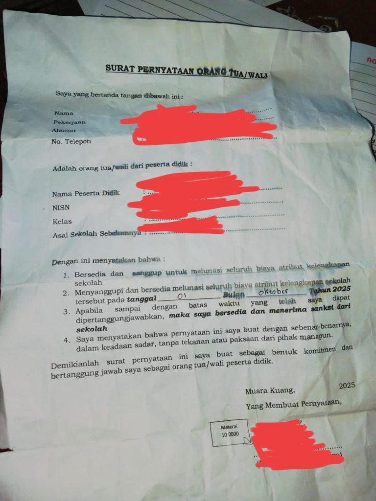 “Sebagai bukti pembayaran anak kami diberi nota tanda terima oleh pihak sekolah,” ujar YNT, Kamis (09/10/2025).