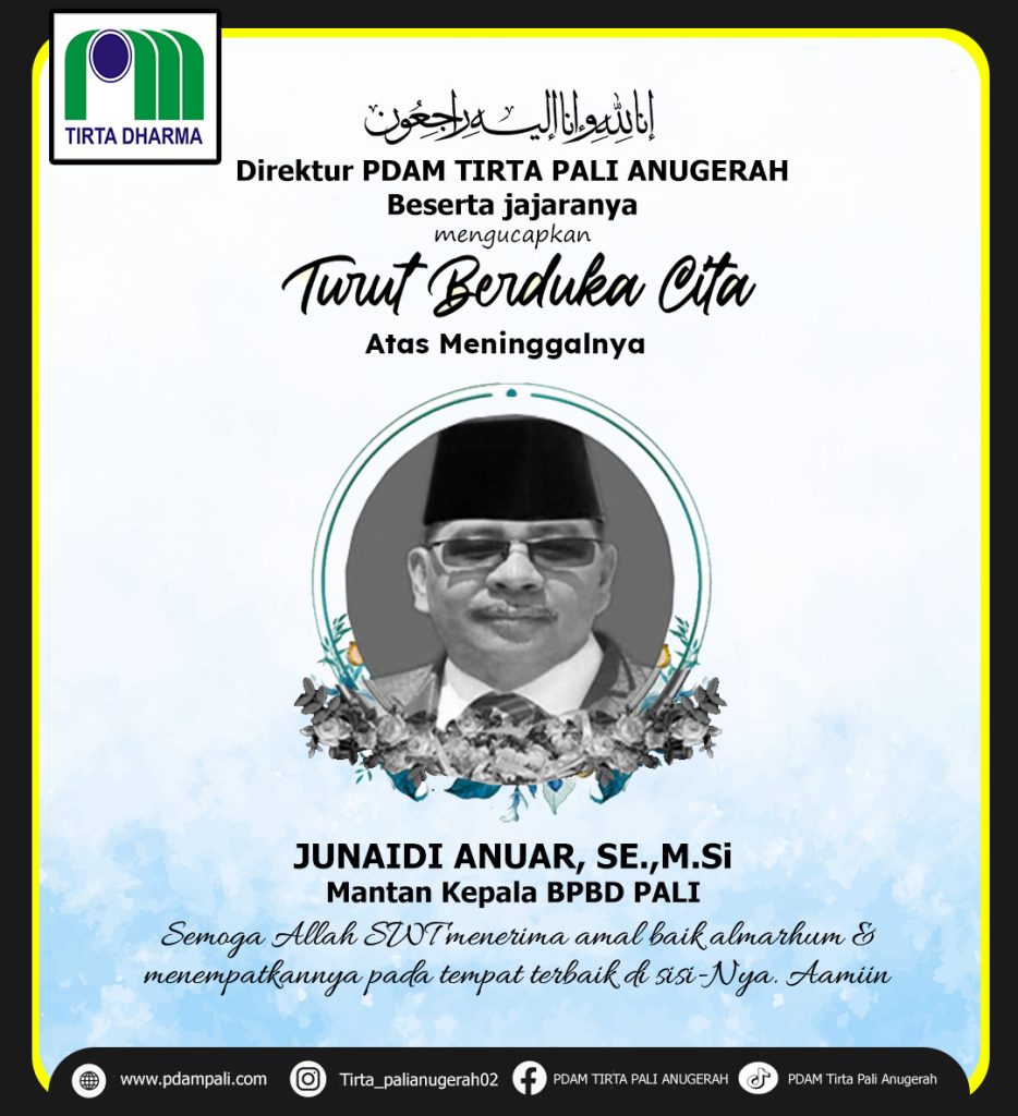 Mendapat kabar duka ini, Segenap Keluarga besar PDAM Tirta Pali Anugerah menyampaikan ucapan turut berduka cita yang mendalam atas meninggalnya Junaidi Anuar Bin M.Zen yang merupakan mantan kepala BPBD Kabupaten PALI, Semoga Allah terima semua amal ibadahnya, diampuni segalal salah dan dosanya serta ditempatkan pada tempat yang baik di sisi-NYA.