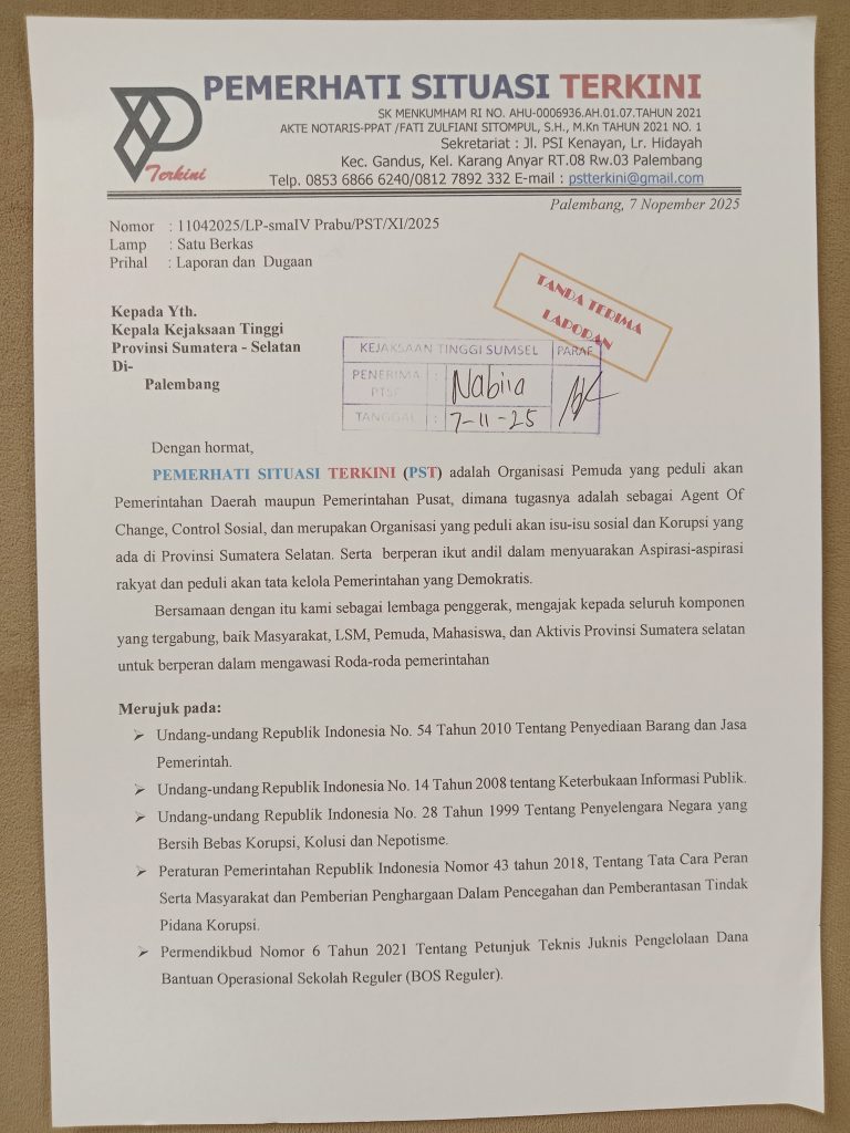 Aksi damai sekaligus menyampaikan Laporan dan Pengaduan (Lapdu) ke Pelayanan Terpadu Satu Pintu (PTSP) yaitu terkait dugaan penyalahgunaan wewenang dan jabatan (Abuse Of Power) yang mengarah pada Tindak Pidana Korupsi (Tipikor) penyimpangan anggaran dana BOS dan dana PSB/PSG di lingkungan SMA Negeri 4 Prabumulih, Provinsi Sumatera Selatan TA. 2020-2024.