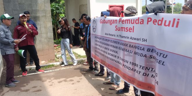 Beritapali.com |Palembang, – Puluhan masa dari lembaga Gabungan Pemuda Peduli Sumsel menggelar aksi demonstrasi di depan kantor Kejaksaan Tinggi Sumatera selatan, mendesak aparat penegak hukum (APH) untuk segera mengusut tuntas dugaan tindak pidana korupsi dalam proyek pengadaan alat peraga praktik sekolah SMK tahun anggaran 2024.