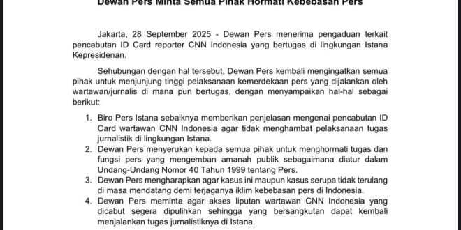 Beritapali.com |Jakarta – Persatuan Wartawan Indonesia (PWI) Pusat menyampaikan keprihatinan atas pencabutan kartu liputan Istana yang dialami wartawan CNN Indonesia usai melontarkan pertanyaan mengenai program Makan Bergizi Gratis (MBG) kepada Presiden Prabowo Subianto, Sabtu (27/9).