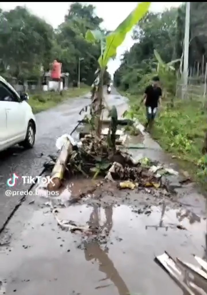 Ungkap kekesalan akan kondisi jalan tersebut warga Sukamanis menanam pisang di badan jalan yang tergenang air seperti di ungkapkan akun tiktok @ predo. bigbos
